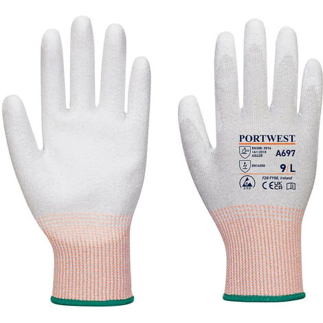 Gant anti-coupures niveau B pour protection contre les coupures et objets tranchants. Jauge 13 – Tricot en polyester en fibre de carbone qui détourne l’électricité statique. Enduction de la paume en PU pour un excellent grip et une excellente dextérité Pour une utilisation dans l’assemblage électronique, les laboratoires et les travaux de précision Utilisable avec la plupart des appareils tactiles